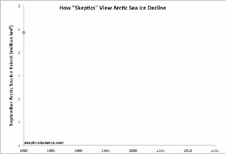 The Daily Mail and the Telegraph recently published sensationalist articles claiming that Arctic sea ice was 60% larger in August 2013 than in August 2012. Again the mistake here is looking at too short a period of time. This year's higher sea ice extent is merely due to the fact that last year's minimum extent was record-shattering. Dana Nucitelli from Skeptical Science predicted a reaction like this in a graph he produced in 2012, where again the overall trend can obviously be seen.