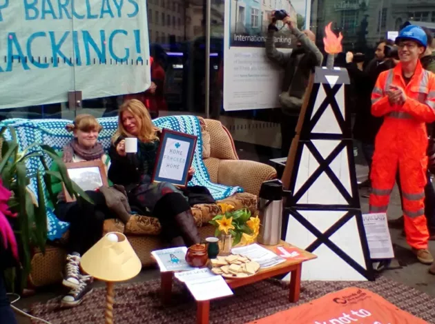 In over 90 branches of Barclays around the country, customers have recently been surprised to meet campaigners Bringing Fracking Home to Barclays. In various creative ways, these campaigners have highlighted the bank's ownership of Third Energy, who want to frack for shale oil in the beautiful North Yorkshire countryside.