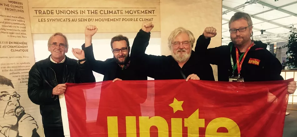 ing (first right, see left) said that the ITUC (International Trade Union Confederation) was developing a Just Transition programme to engage trade unions, governments and communities in demands for investments in low carbon technologies, green jobs and new skills. Climate change would drive up global poverty: so zero poverty and zero carbon were two core issues for the ITUC.