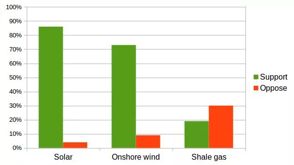 This is fantasy. As well as the climate impacts and the questionable economic calculations (Sam Hall, of the think tank Bright Blue, explained in the Independent "As the UK is part of a large European gas market, the impact of fracking on consumer bills is likely to be minimal... the Conservativesā priority should be incentivising cheap renewables, which are attracting the majority of new energy investment worldwide, as part of its modern industrial strategy.ā) fracking is extremely unpopular, especially compared with renewable energy (the graph on the right shows the latest government survey of attitudes).
